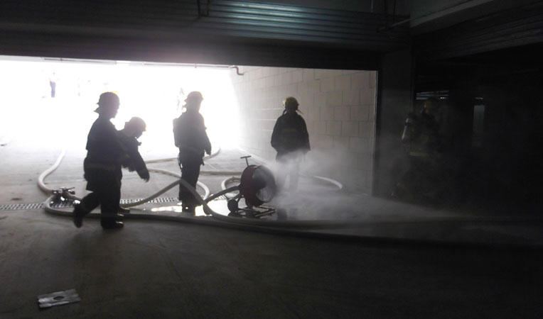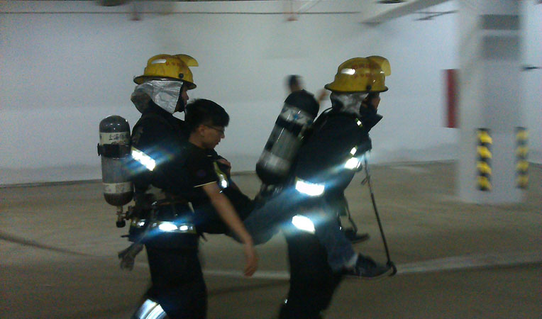 根據演練前布置,南陵消防大隊到達現場后,迅速展開偵查、警戒工作。在了解現場情況后,消防隊員兵分兩隊,一路直奔地下車庫救人,一路奔向高層住宅滅火。10分鐘后,火情被控制,并成功從地下室營救出1名被困人員。
