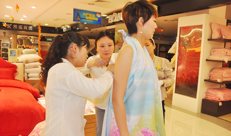 據了解,今年華億國際開展了“三項三語”競賽活動,所謂的“三項”主要是指專柜無顧客時要做到:商品陳列要整潔美觀富有吸引力;加強專業知識了解,掌握商品庫存明細;確保專柜內衛生清潔,保證商場整體美觀。而“三語”主要指專柜有顧客時要做到:當顧客走入柜區時,微笑服務,使用迎賓語:“您好!歡迎光臨!”;當顧客對某一樣商品感興趣時,鼓勵顧客試穿試用,如讓顧客等候時,需使用致歉語:“對不起,請稍等!”;當顧客離開柜臺時,不論商品有無成交,對顧客的態度要從一而終,并使用道別語:“請走好!歡迎下次光臨!”在“三項三語”活動基礎上,富有創新意識的華億員工們,開展了這樣一場“神奇的裹布藝術”活動,充分展現了樓層服務人員,對工作的熟悉,對環境的熟悉,和對美的熟悉。一葉知秋,從這點就反映出員工厚實的基本功,為消費者服務,打下了深厚的基礎。