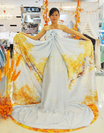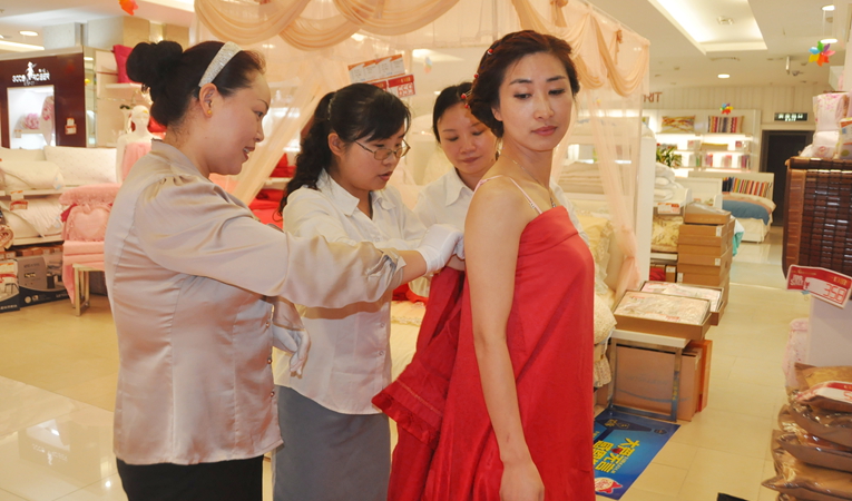 員工們根據春夏秋冬4個主題,將家紡布藝裝飾、點綴在美麗的模特身上,打造“神奇的裹布藝術”系列作品,體現出智慧與美的結合,受到了顧客的廣泛好評。