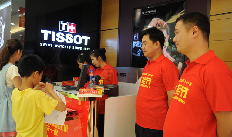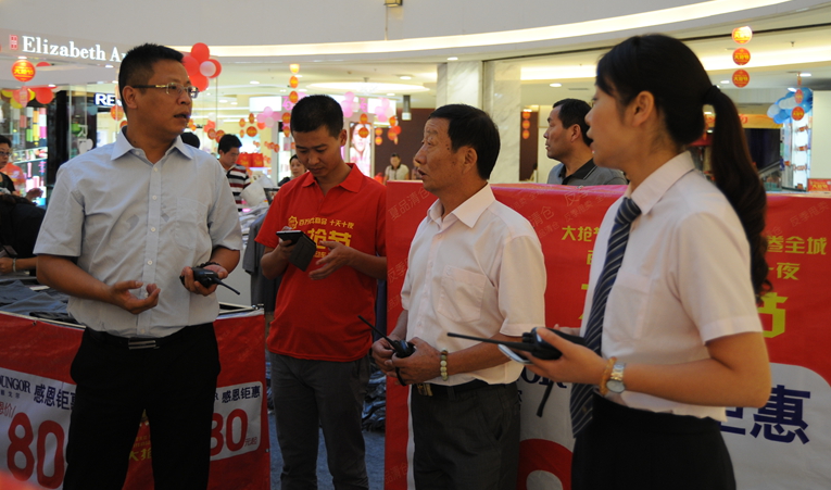 現(xiàn)場所有一線工作人員都換上了大紅色的工作服,上面標(biāo)注著顯眼的“大搶節(jié)”字樣,方便工作人員之間的協(xié)調(diào)工作,更重要的是消費(fèi)者可以隨時隨地找到華億員工咨詢幫忙。特別為這次活動添加的44 臺收銀機(jī),早已擺放到位,調(diào)試完畢,兩座商場98臺收銀機(jī),整機(jī)待發(fā)。華億集團(tuán)其他戰(zhàn)線的近千名員工也輪番趕來支援,幫助維持秩序。70名專業(yè)安保人員分布在華億國際南北兩樓,巡邏查看和發(fā)放獎品等地重點蹲點結(jié)合,確保消費(fèi)者“搶”的放心、舒心、省心。