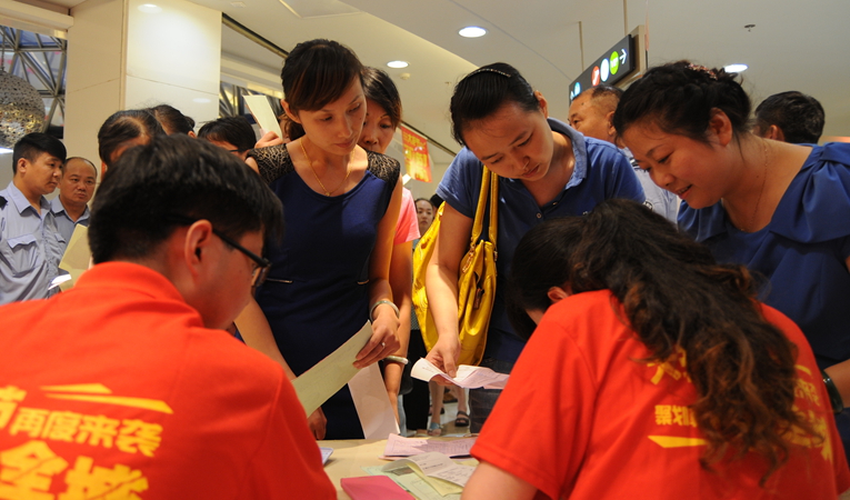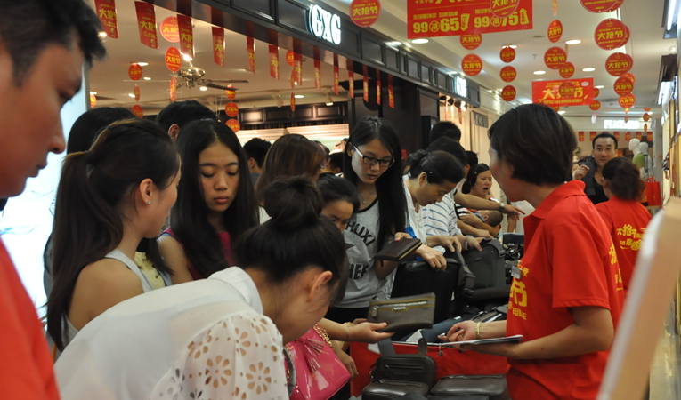 臨近19點,消費(fèi)者不約而同,如潮水般涌來,大搶節(jié)正式開始!或是一家老小齊出動、或是情侶攜手甜蜜出擊、或是朋友相邀、或是單槍匹馬。精明的早有“預(yù)謀”的,直接奔向早已選定的商品,誰去收銀臺排隊,誰去禮品臺排隊,誰去營業(yè)員那里開票, 家人分工明確;沒提前打好“預(yù)搶”戰(zhàn)役的,這個時候只能帶著有些急迫的心情,四處尋望了。一些沒有預(yù)搶的消費(fèi)者,覺得亡羊補(bǔ)牢為時不晚,立即現(xiàn)場分工。