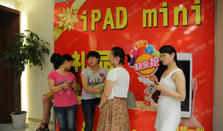 晚上7點,在IPADmini禮品領(lǐng)取專柜前,竟然都已經(jīng)有人在排隊,離零點還有5個小時,也就是說他們還要等上5個小時,“最早的下午2點就來了”, 在電動車發(fā)放點,同樣離送出時間還有5個小時的時候,就有人在等待了,還有人帶來了小板凳、扇子、水,有備無患,做好了打持久戰(zhàn)的準(zhǔn)備。