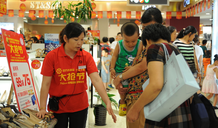 “大搶節(jié) 大減價”,營業(yè)員的介紹聲開始不絕于耳,商場內(nèi)的分貝立即高了起來,人聲鼎沸,為了讓大家聽的清晰,營業(yè)員們都備上了擴(kuò)音器,全副武裝的樣子,一下子把消費(fèi)者的熱情全點燃了。從大門到柜臺,顧客們幾乎是你追我趕,一對夫婦在箭魚鯊男裝專柜一下手就買了12件。一位大姐報了鞋子的號碼后,就開始“亂點鴛鴦譜”,“這雙、這雙、這雙,全部打包,遲了就沒了,大小不合適,回頭再來換,華億服務(wù)好著呢!”哎!真是買的沒有賣的精!
