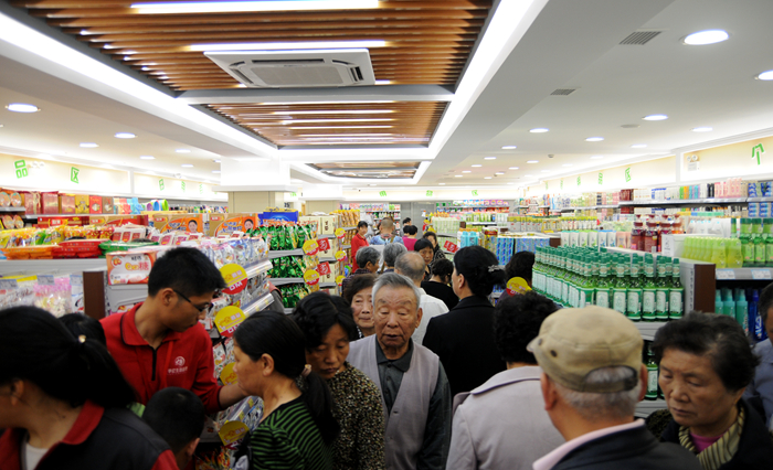 上午8時,華億生活超市徽商春天店門前人山人海,超市會員卡辦理區排起了長長的隊伍,超市外的特惠商品區域吸引了不少購物者。在簡短的開業剪彩儀式后,數百名消費者涌進超市,一時間一樓的生鮮區、酒水區、冷凍冷藏區,二樓的日用百貨區,購物人群摩肩接踵,不少消費者將購物籃高高舉起頂在頭上以便走動。開業數分鐘后,收銀臺排起了付款長龍。華億生活超市的每一位員工堅守自己的崗位,現場火爆且秩序井然。
