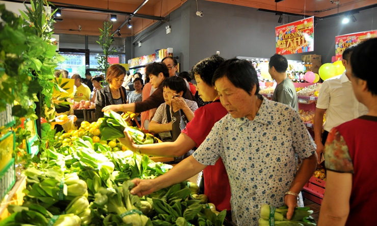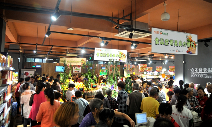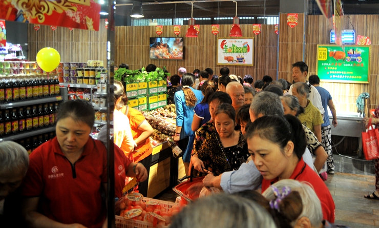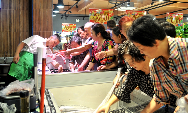 早上7時58分,在華億管樂隊演奏的喜慶樂曲聲中,開業(yè)剪彩儀式正式開始,張靖副總裁等領(lǐng)導(dǎo)為樂鮮生活儒林西苑店開業(yè)剪彩。簡短的開業(yè)儀式后,等候在店外的數(shù)百名居民涌進(jìn)超市,新鮮便宜的生鮮產(chǎn)品,干凈舒適的購物環(huán)境,讓消費者贊不絕口。超市的過道、地堆前擠滿了選購商品的消費者。一位大媽一邊挑選新鮮蔬菜,一邊說道,“華億超市的蔬菜比其他菜市場便宜不少,菜很新鮮干凈?!滨r肉區(qū)肉品價格便宜、品相好,成為消費者搶購的熱銷商品。開業(yè)當(dāng)天,每個貨架旁都安排了專職工作人員及時補(bǔ)貨,為確保貨品充足。